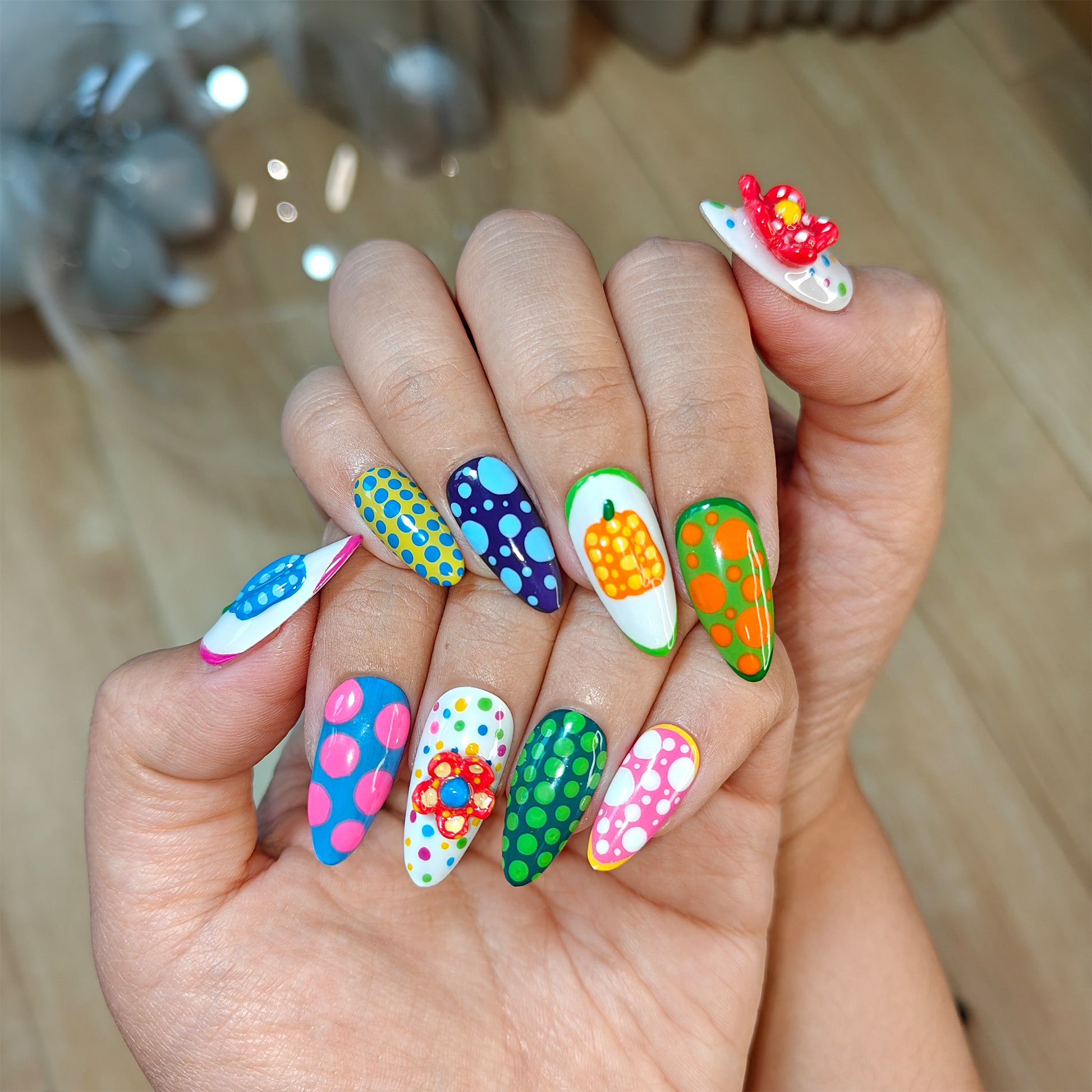 Inspired by Yayoi Kusama's polka dot universe, the nail surface is covered with dots of varying sizes and scattered colors.